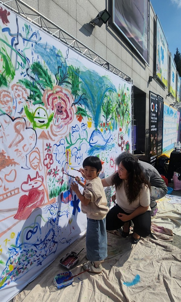 낮 12시 아람누리 해받이터에서는 그림책 작가 김중석이 ‘함께 그리니까, 좋다’를 주제로 2시간 동안 그림 그리기 공연을 진행했다. 참가자들은 실시간으로 눈앞에서 그림책이 만들어지는 과정을 체험하며 어른·아이 할 것 없이 따뜻한 이야기에 함께 공감했다.